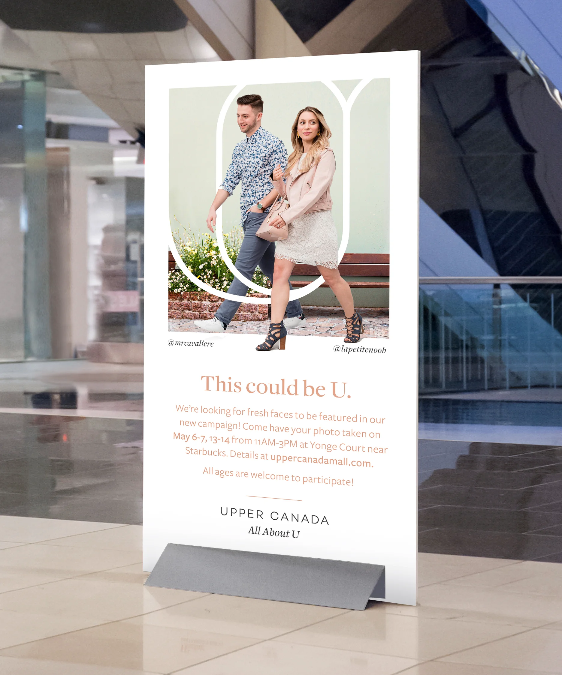 Models will be the real people of the Upper Canada community. A casting call is held on the premises. Tryouts are advertised on the website as well on signage in the property and on Upper Canada’s social channels. To audition, there will be “U” stages set up throughout the property where customers can take their photos and submit online. Our most talented models are chosen to be part of the latest creative and are asked to come back for a real photoshoot.